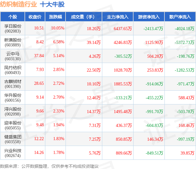 个股表现方面,纺织制造行业当日领涨股为孚日股份(002083),该股当日报收10.51,上涨10.05%,成交量18.2万,主力资金净流入6437.65万元。新澳股份(603889)以上涨6.58%紧随其后,该股当日成交量39.14万,主力资金净流入4246.83万元。除此之外,云中马(603130)、凤竹纺织(600493)、古麒绒材(001390)均进入当日牛股之列。具体个股列表见下表: