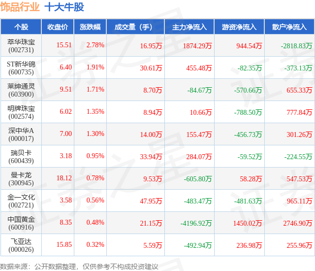 个股表现方面,饰品行业当日领涨股为萃华珠宝(002731),该股当日报收15.51,上涨2.78%,成交量16.95万,主力资金净流入1874.29万元。ST新华锦(600735)以上涨1.91%紧随其后,该股当日成交量30.61万,主力资金净流入455.48万元。除此之外,莱绅通灵(603900)、明牌珠宝(002574)、深中华A(000017)均进入当日牛股之列。具体个股列表见下表: