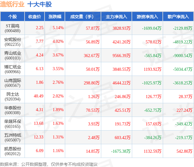 个股表现方面,造纸行业当日领涨股为ST晨鸣(000488),该股当日报收2.25,上涨5.14%,成交量57.87万,主力资金净流入3828.93万元。安妮股份(002235)以上涨4.02%紧随其后,该股当日成交量56.89万,主力资金净流入4241.2万元。除此之外,青山纸业(600103)、博汇纸业(600966)、山鹰国际(600567)均进入当日牛股之列。具体个股列表见下表: