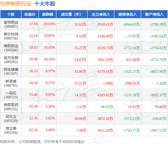 个股表现方面,化学制药行业当日领涨股为富祥药业(300497),该股当日报收17.5,上涨20.03%,成交量52.65万,主力资金净流入9743.41万元。赛分科技(688758)以上涨10.92%紧随其后,该股当日成交量9.1万,主力资金净流入1240.49万元。除此之外,海辰药业(300584)、益方生物(688382)、民生健康(301507)均进入当日牛股之列。具体个股列表见下表: