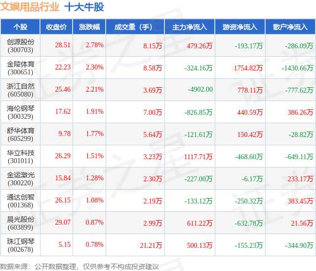 个股表现方面,文娱用品行业当日领涨股为创源股份(300703),该股当日报收28.51,上涨2.78%,成交量8.15万,主力资金净流入479.26万元。金陵体育(300651)以上涨2.3%紧随其后,该股当日成交量8.58万,主力资金净流出324.16万元。除此之外,浙江自然(605080)、海伦钢琴(300329)、舒华体育(605299)均进入当日牛股之列。具体个股列表见下表: