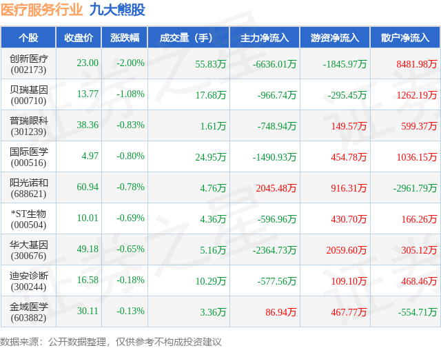 个股表现方面,医疗服务行业当日领跌股为创新医疗(002173),该股当日报收23.0,下跌2.0%,成交量55.83万,主力资金净流出6636.01万元。贝瑞基因(000710)以下跌1.08%紧随其后,该股当日成交量17.68万,主力资金净流出966.74万元。除此之外,普瑞眼科(301239)、国际医学(000516)、阳光诺和(688621)均进入当日熊股之列。具体个股列表见下表: