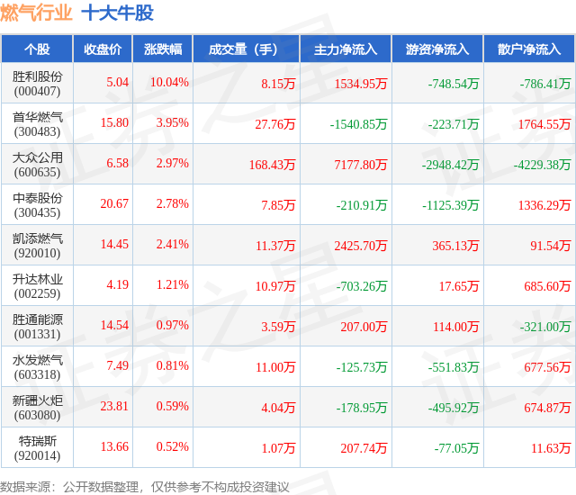 个股表现方面,燃气行业当日领涨股为胜利股份(000407),该股当日报收5.04,上涨10.04%,成交量8.15万,主力资金净流入1534.95万元。首华燃气(300483)以上涨3.95%紧随其后,该股当日成交量27.76万,主力资金净流出1540.85万元。除此之外,大众公用(600635)、中泰股份(300435)、凯添燃气(920010)均进入当日牛股之列。具体个股列表见下表:
