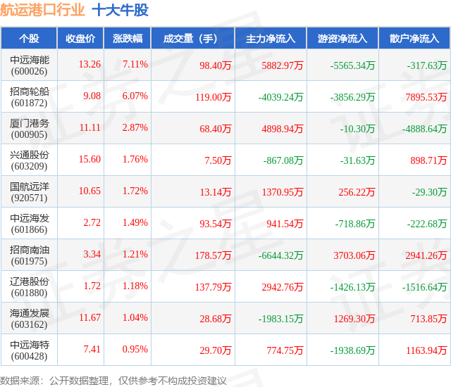 个股表现方面,航运港口行业当日领涨股为中远海能(600026),该股当日报收13.26,上涨7.11%,成交量98.4万,主力资金净流入5882.97万元。招商轮船(601872)以上涨6.07%紧随其后,该股当日成交量119.0万,主力资金净流出4039.24万元。除此之外,厦门港务(000905)、兴通股份(603209)、国航远洋(920571)均进入当日牛股之列。具体个股列表见下表: