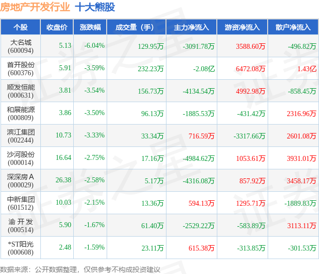个股表现方面,房地产开发行业当日领跌股为大名城(600094),该股当日报收5.13,下跌6.04%,成交量129.95万,主力资金净流出3091.78万元。首开股份(600376)以下跌3.59%紧随其后,该股当日成交量232.23万,主力资金净流出2.08亿元。除此之外,顺发恒能(000631)、和展能源(000809)、滨江集团(002244)均进入当日熊股之列。具体个股列表见下表: