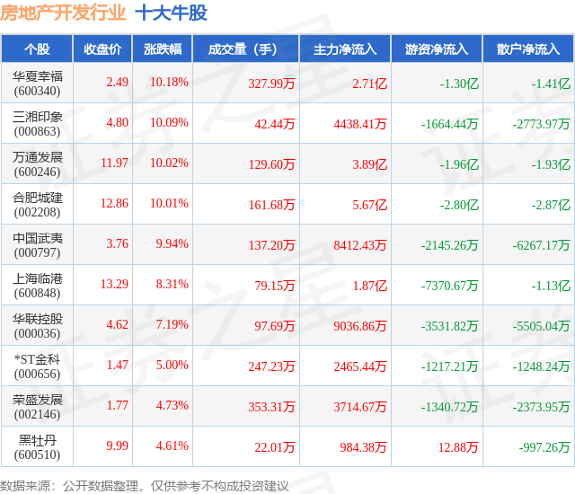 个股表现方面,房地产开发行业当日领涨股为华夏幸福(600340),该股当日报收2.49,上涨10.18%,成交量327.99万,主力资金净流入2.71亿元。三湘印象(000863)以上涨10.09%紧随其后,该股当日成交量42.44万,主力资金净流入4438.41万元。除此之外,万通发展(600246)、合肥城建(002208)、中国武夷(000797)均进入当日牛股之列。具体个股列表见下表: