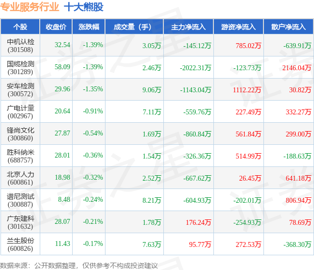 个股表现方面,专业服务行业当日领跌股为中机认检(301508),该股当日报收32.54,下跌1.39%,成交量3.05万,主力资金净流出145.12万元。国缆检测(301289)以下跌1.39%紧随其后,该股当日成交量2.46万,主力资金净流出2022.31万元。除此之外,安车检测(300572)、广电计量(002967)、锋尚文化(300860)均进入当日熊股之列。具体个股列表见下表: