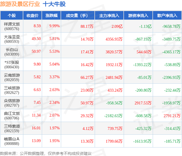 个股表现方面,旅游及景区行业当日领涨股为祥源文旅(600576),该股当日报收8.59,上涨9.99%,成交量88.17万,主力资金净流入2.09亿元。大连圣亚(600593)以上涨5.81%紧随其后,该股当日成交量14.7万,主力资金净流入4356.93万元。除此之外,长白山(603099)、*ST张股(000430)、云南旅游(002059)均进入当日牛股之列。具体个股列表见下表: