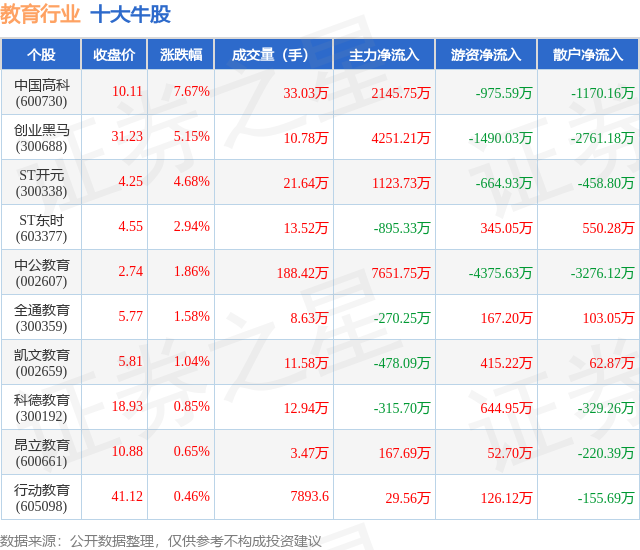个股表现方面,教育行业当日领涨股为中国高科(600730),该股当日报收10.11,上涨7.67%,成交量33.03万,主力资金净流入2145.75万元。创业黑马(300688)以上涨5.15%紧随其后,该股当日成交量10.78万,主力资金净流入4251.21万元。除此之外,ST开元(300338)、ST东时(603377)、中公教育(002607)均进入当日牛股之列。具体个股列表见下表: