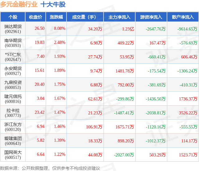 个股表现方面,多元金融行业当日领涨股为瑞达期货(002961),该股当日报收26.5,上涨8.08%,成交量34.2万,主力资金净流入1.23亿元。南华期货(603093)以上涨2.48%紧随其后,该股当日成交量6.98万,主力资金净流入409.22万元。除此之外,*ST仁东(002647)、永安期货(600927)、九鼎投资(600053)均进入当日牛股之列。具体个股列表见下表:
