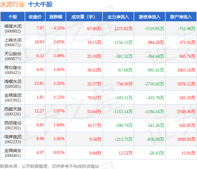 个股表现方面,水泥行业当日领涨股为福建水泥(600802),该股当日报收7.87,上涨4.52%,成交量67.0万,主力资金净流入2271.82万元。上峰水泥(000672)以上涨2.65%紧随其后,该股当日成交量19.15万,主力资金净流出1156.13万元。除此之外,天山股份(000877)、青松建化(600425)、海螺水泥(600585)均进入当日牛股之列。具体个股列表见下表:
