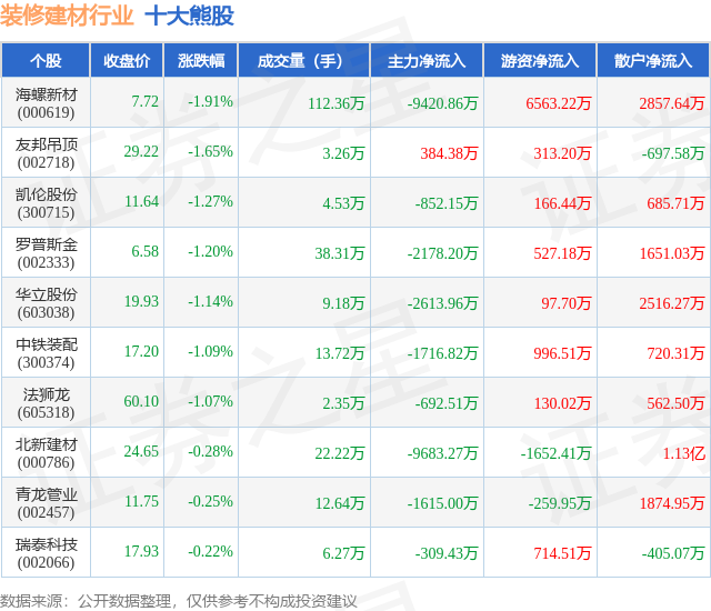 个股表现方面,装修建材行业当日领跌股为海螺新材(000619),该股当日报收7.72,下跌1.91%,成交量112.36万,主力资金净流出9420.86万元。友邦吊顶(002718)以下跌1.65%紧随其后,该股当日成交量3.26万,主力资金净流入384.38万元。除此之外,凯伦股份(300715)、罗普斯金(002333)、华立股份(603038)均进入当日熊股之列。具体个股列表见下表: