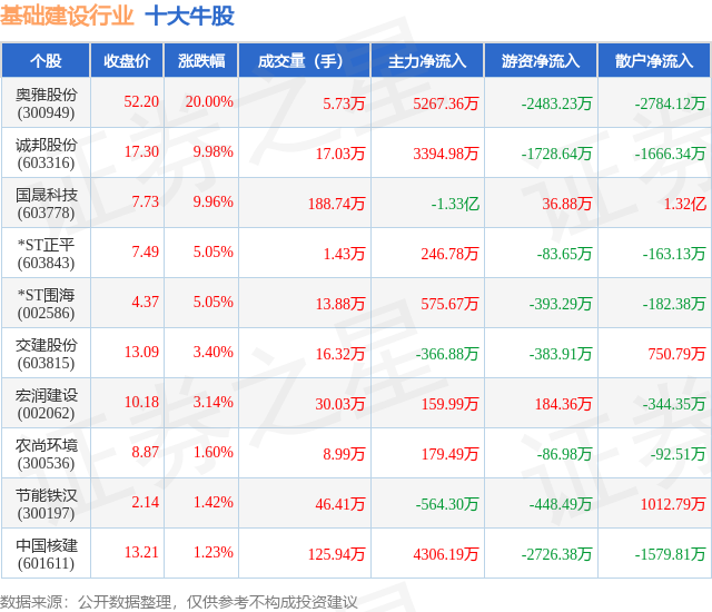 个股表现方面,基础建设行业当日领涨股为奥雅股份(300949),该股当日报收52.2,上涨20.0%,成交量5.73万,主力资金净流入5267.36万元。诚邦股份(603316)以上涨9.98%紧随其后,该股当日成交量17.03万,主力资金净流入3394.98万元。除此之外,国晟科技(603778)、*ST正平(603843)、*ST围海(002586)均进入当日牛股之列。具体个股列表见下表: