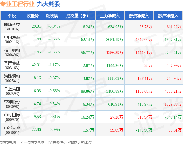 个股表现方面,专业工程行业当日领跌股为能辉科技(301046),该股当日报收29.01,下跌3.04%,成交量6.24万,主力资金净流出634.95万元。中国海诚(002116)以下跌2.63%紧随其后,该股当日成交量62.14万,主力资金净流出3051.19万元。除此之外,精工钢构(600496)、圣晖集成(603163)、鸿路钢构(002541)均进入当日熊股之列。具体个股列表见下表: