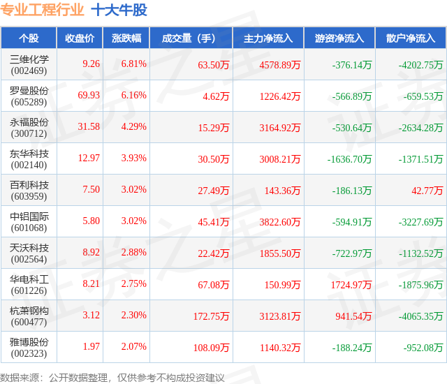 个股表现方面,专业工程行业当日领涨股为三维化学(002469),该股当日报收9.26,上涨6.81%,成交量63.5万,主力资金净流入4578.89万元。罗曼股份(605289)以上涨6.16%紧随其后,该股当日成交量4.62万,主力资金净流入1226.42万元。除此之外,永福股份(300712)、东华科技(002140)、百利科技(603959)均进入当日牛股之列。具体个股列表见下表: