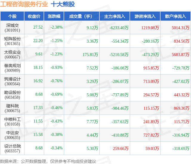 个股表现方面,工程咨询服务行业当日领跌股为深城交(301091),该股当日报收27.52,下跌2.38%,成交量9.12万,主力资金净流出6233.4万元。矩阵股份(301365)以下跌1.25%紧随其后,该股当日成交量3.36万,主力资金净流出554.34万元。除此之外,太极实业(600667)、蕾奥规划(300989)、筑博设计(300564)均进入当日熊股之列。具体个股列表见下表: