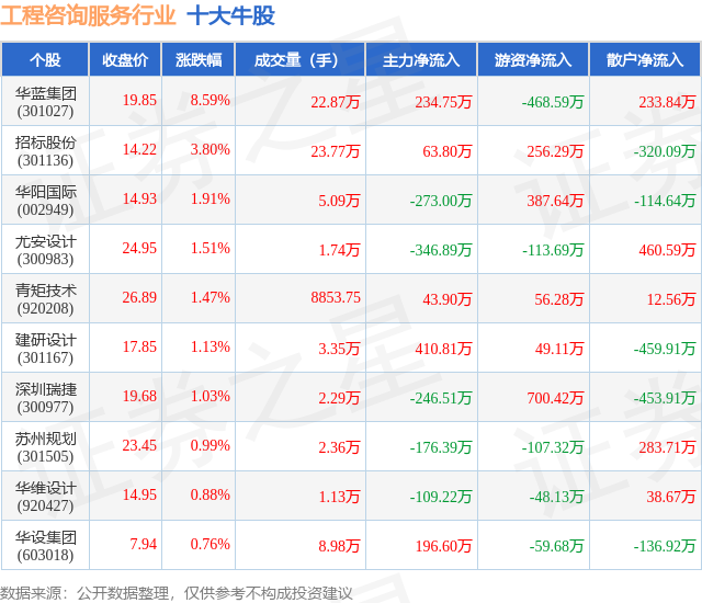 个股表现方面,工程咨询服务行业当日领涨股为华蓝集团(301027),该股当日报收19.85,上涨8.59%,成交量22.87万,主力资金净流入234.75万元。招标股份(301136)以上涨3.8%紧随其后,该股当日成交量23.77万,主力资金净流入63.8万元。除此之外,华阳国际(002949)、尤安设计(300983)、青矩技术(920208)均进入当日牛股之列。具体个股列表见下表: