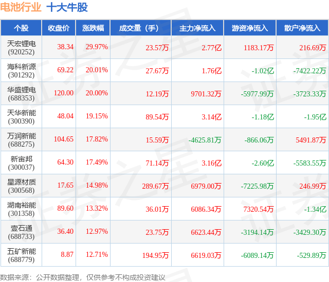 个股表现方面,电池行业当日领涨股为天宏锂电(920252),该股当日报收38.34,上涨29.97%,成交量23.57万,主力资金净流入2.77亿元。海科新源(301292)以上涨20.01%紧随其后,该股当日成交量27.67万,主力资金净流入1.76亿元。除此之外,华盛锂电(688353)、天华新能(300390)、万润新能(688275)均进入当日牛股之列。具体个股列表见下表: