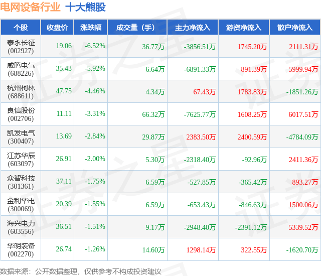 个股表现方面,电网设备行业当日领跌股为泰永长征(002927),该股当日报收19.06,下跌6.52%,成交量36.77万,主力资金净流出3856.51万元。威腾电气(688226)以下跌5.92%紧随其后,该股当日成交量6.64万,主力资金净流出6891.33万元。除此之外,杭州柯林(688611)、良信股份(002706)、凯发电气(300407)均进入当日熊股之列。具体个股列表见下表:
