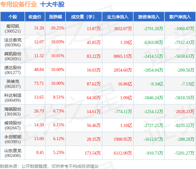 个股表现方面,专用设备行业当日领涨股为爱司凯(300521),该股当日报收31.2,上涨10.25%,成交量13.87万,主力资金净流入3852.07万元。法兰泰克(603966)以上涨10.03%紧随其后,该股当日成交量45.85万,主力资金净流入1.39亿元。除此之外,冀凯股份(002691)、速达股份(001277)、英维克(002837)均进入当日牛股之列。具体个股列表见下表: