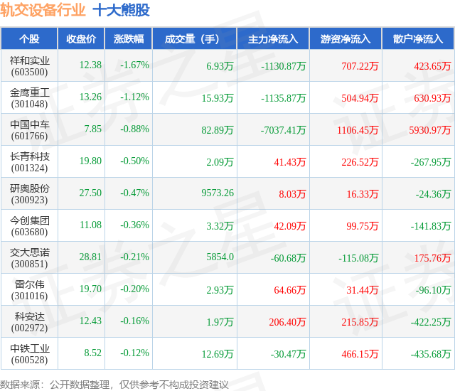 个股表现方面,轨交设备行业当日领跌股为祥和实业(603500),该股当日报收12.38,下跌1.67%,成交量6.93万,主力资金净流出1130.87万元。金鹰重工(301048)以下跌1.12%紧随其后,该股当日成交量15.93万,主力资金净流出1135.87万元。除此之外,中国中车(601766)、长青科技(001324)、研奥股份(300923)均进入当日熊股之列。具体个股列表见下表: