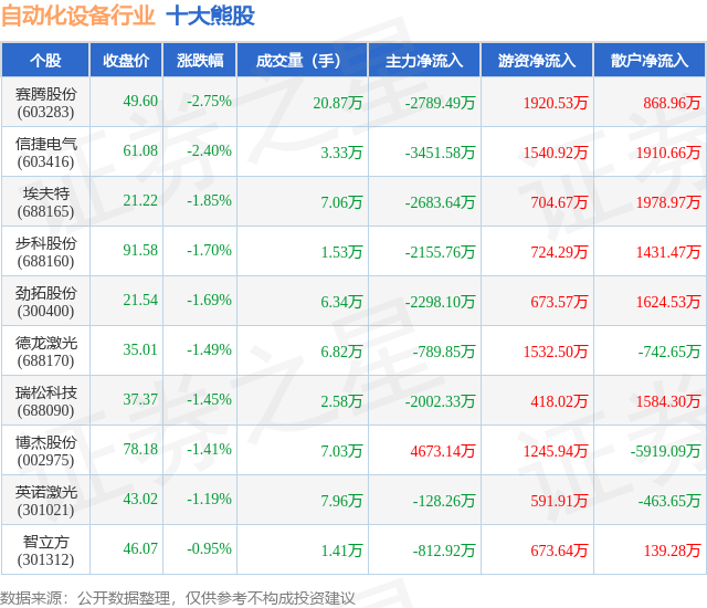 个股表现方面,自动化设备行业当日领跌股为赛腾股份(603283),该股当日报收49.6,下跌2.75%,成交量20.87万,主力资金净流出2789.49万元。信捷电气(603416)以下跌2.4%紧随其后,该股当日成交量3.33万,主力资金净流出3451.58万元。除此之外,埃夫特(688165)、步科股份(688160)、劲拓股份(300400)均进入当日熊股之列。具体个股列表见下表: