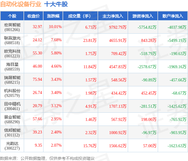 个股表现方面,自动化设备行业当日领涨股为宏英智能(001266),该股当日报收32.97,上涨10.01%,成交量6.73万,主力资金净流入9792.79万元。联赢激光(688518)以上涨7.68%紧随其后,该股当日成交量23.81万,主力资金净流入4655.91万元。除此之外,欧克科技(001223)、海目星(688559)、瑞晟智能(688215)均进入当日牛股之列。具体个股列表见下表: