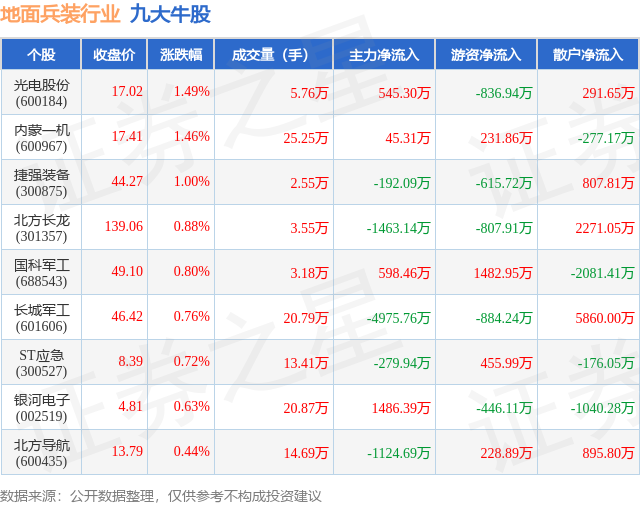 个股表现方面,地面兵装行业当日领涨股为光电股份(600184),该股当日报收17.02,上涨1.49%,成交量5.76万,主力资金净流入545.3万元。内蒙一机(600967)以上涨1.46%紧随其后,该股当日成交量25.25万,主力资金净流入45.31万元。除此之外,捷强装备(300875)、北方长龙(301357)、国科军工(688543)均进入当日牛股之列。具体个股列表见下表: