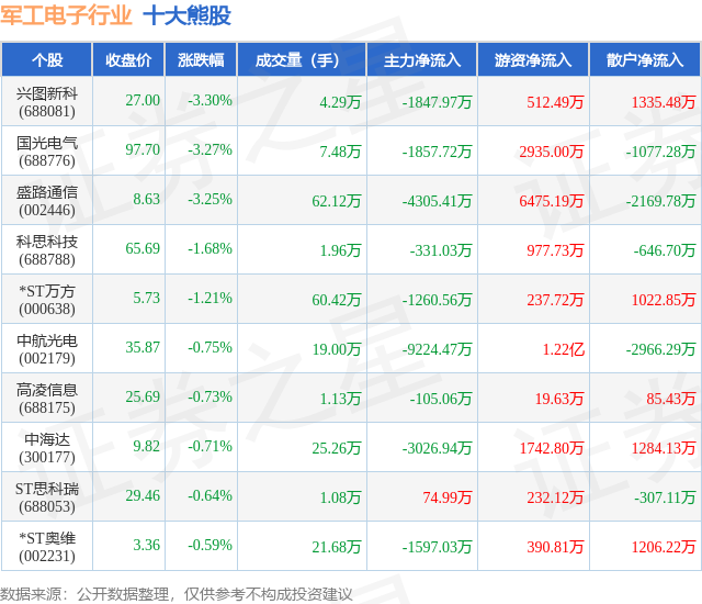 个股表现方面,军工电子行业当日领跌股为兴图新科(688081),该股当日报收27.0,下跌3.3%,成交量4.29万,主力资金净流出1847.97万元。国光电气(688776)以下跌3.27%紧随其后,该股当日成交量7.48万,主力资金净流出1857.72万元。除此之外,盛路通信(002446)、科思科技(688788)、*ST万方(000638)均进入当日熊股之列。具体个股列表见下表: