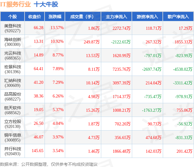 个股表现方面,IT服务行业当日领涨股为美登科技(920227),该股当日报收66.28,上涨13.57%,成交量1.86万,主力资金净流入2272.74万元。海峡创新(300300)以上涨10.92%紧随其后,该股当日成交量249.87万,主力资金净流出2122.65万元。除此之外,光云科技(688365)、宏景科技(301396)、汇纳科技(300609)均进入当日牛股之列。具体个股列表见下表: