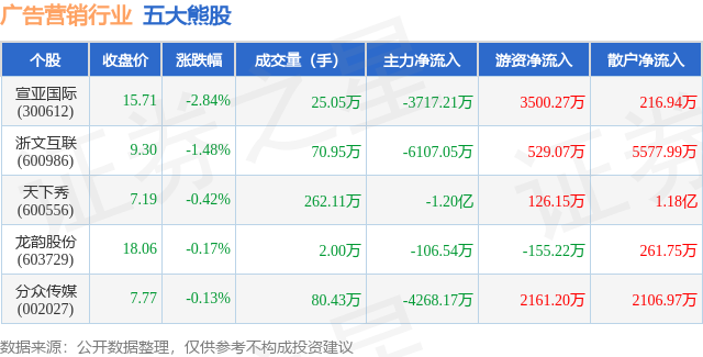 个股表现方面,广告营销行业当日领跌股为宣亚国际(300612),该股当日报收15.71,下跌2.84%,成交量25.05万,主力资金净流出3717.21万元。浙文互联(600986)以下跌1.48%紧随其后,该股当日成交量70.95万,主力资金净流出6107.05万元。除此之外,天下秀(600556)、龙韵股份(603729)、分众传媒(002027)均进入当日熊股之列。具体个股列表见下表: