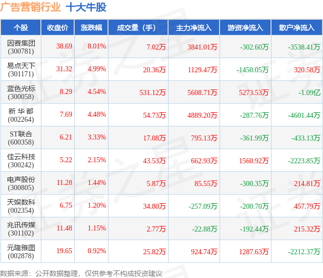 个股表现方面,广告营销行业当日领涨股为因赛集团(300781),该股当日报收38.69,上涨8.01%,成交量7.02万,主力资金净流入3841.01万元。易点天下(301171)以上涨4.99%紧随其后,该股当日成交量20.36万,主力资金净流入1129.47万元。除此之外,蓝色光标(300058)、新 华 都(002264)、ST联合(600358)均进入当日牛股之列。具体个股列表见下表: