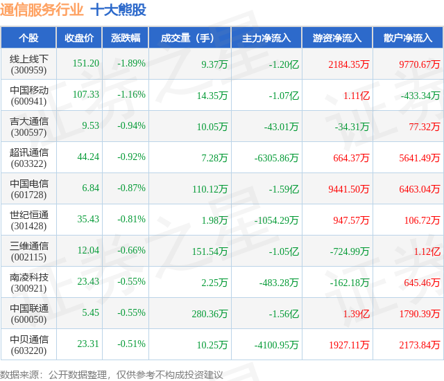 个股表现方面,通信服务行业当日领跌股为线上线下(300959),该股当日报收151.2,下跌1.89%,成交量9.37万,主力资金净流出1.2亿元。中国移动(600941)以下跌1.16%紧随其后,该股当日成交量14.35万,主力资金净流出1.07亿元。除此之外,吉大通信(300597)、超讯通信(603322)、中国电信(601728)均进入当日熊股之列。具体个股列表见下表: