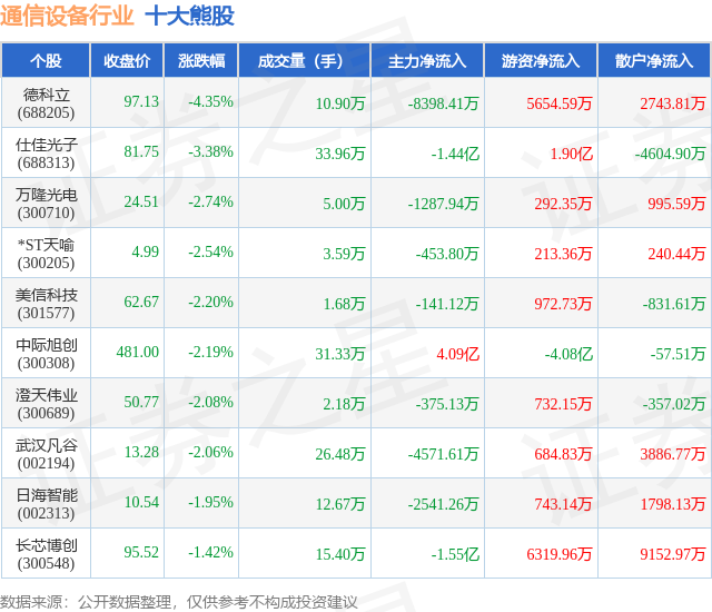 个股表现方面,通信设备行业当日领跌股为德科立(688205),该股当日报收97.13,下跌4.35%,成交量10.9万,主力资金净流出8398.41万元。仕佳光子(688313)以下跌3.38%紧随其后,该股当日成交量33.96万,主力资金净流出1.44亿元。除此之外,万隆光电(300710)、*ST天喻(300205)、美信科技(301577)均进入当日熊股之列。具体个股列表见下表: