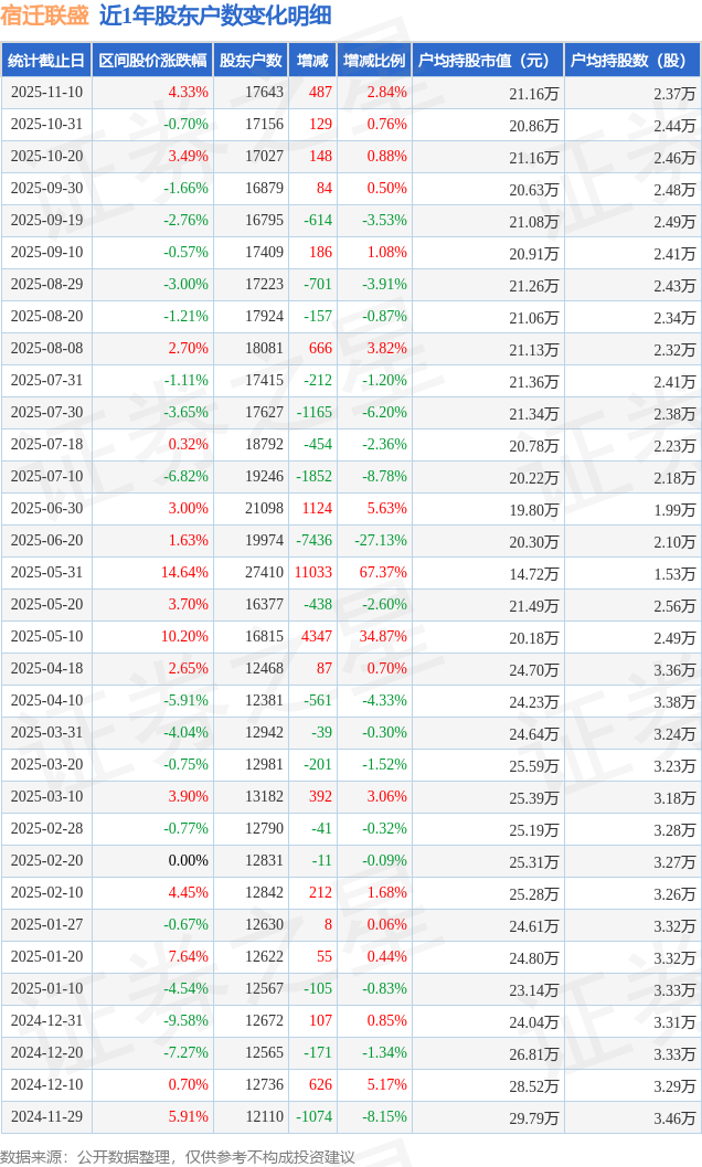 证券之星消息,近日宿迁联盛披露,截至2025年11月10日公司股东户数为1.76万户,较10月31日增加487.0户,增幅为2.84%。户均持股数量由上期的2.44万股减少至2.37万股,户均持股市值为21.16万元。