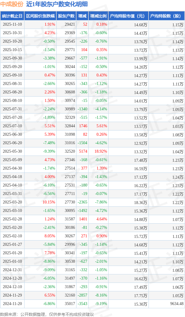 从股价来看,2025年10月31日至2025年11月10日,中成股份区间涨幅为1.91%,在此期间股东户数增加52.0户,增幅为0.18%。