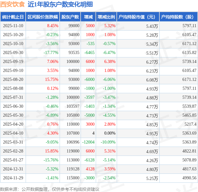 从股价来看,2025年10月20日至2025年11月10日,西安饮食区间涨幅为8.45%,在此期间股东户数增加5000.0户,增幅为5.32%。
