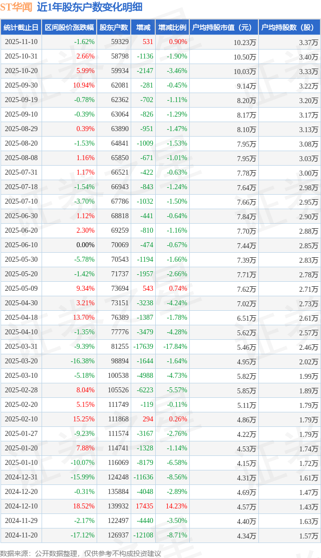 从股价来看,2025年10月31日至2025年11月10日,ST华闻区间跌幅为1.62%,在此期间股东户数增加531.0户,增幅为0.9%。