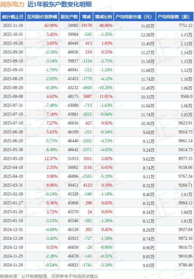 从股价来看,2025年10月31日至2025年11月10日,闽东电力区间涨幅为42.9%,在此期间股东户数增加1.92万户,增幅为48.06%。