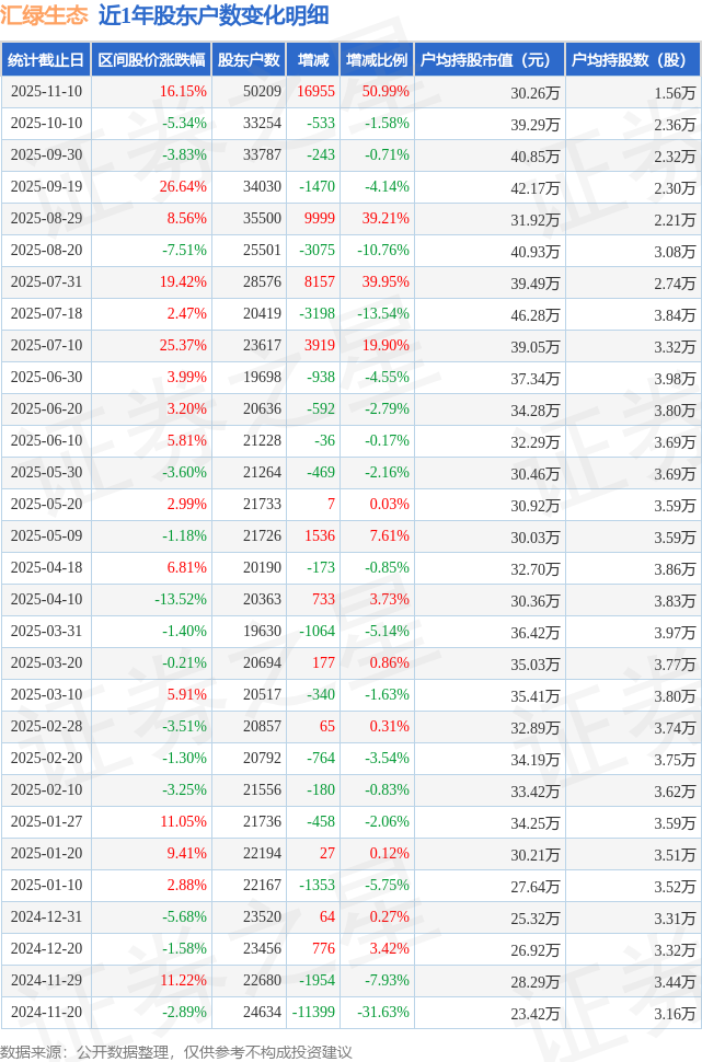 从股价来看,2025年10月10日至2025年11月10日,汇绿生态区间涨幅为16.15%,在此期间股东户数增加1.7万户,增幅为50.99%。