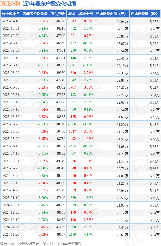 从股价来看,2025年10月31日至2025年11月10日,浙江交科区间涨幅为3.35%,在此期间股东户数增加42.0户,增幅为0.09%。