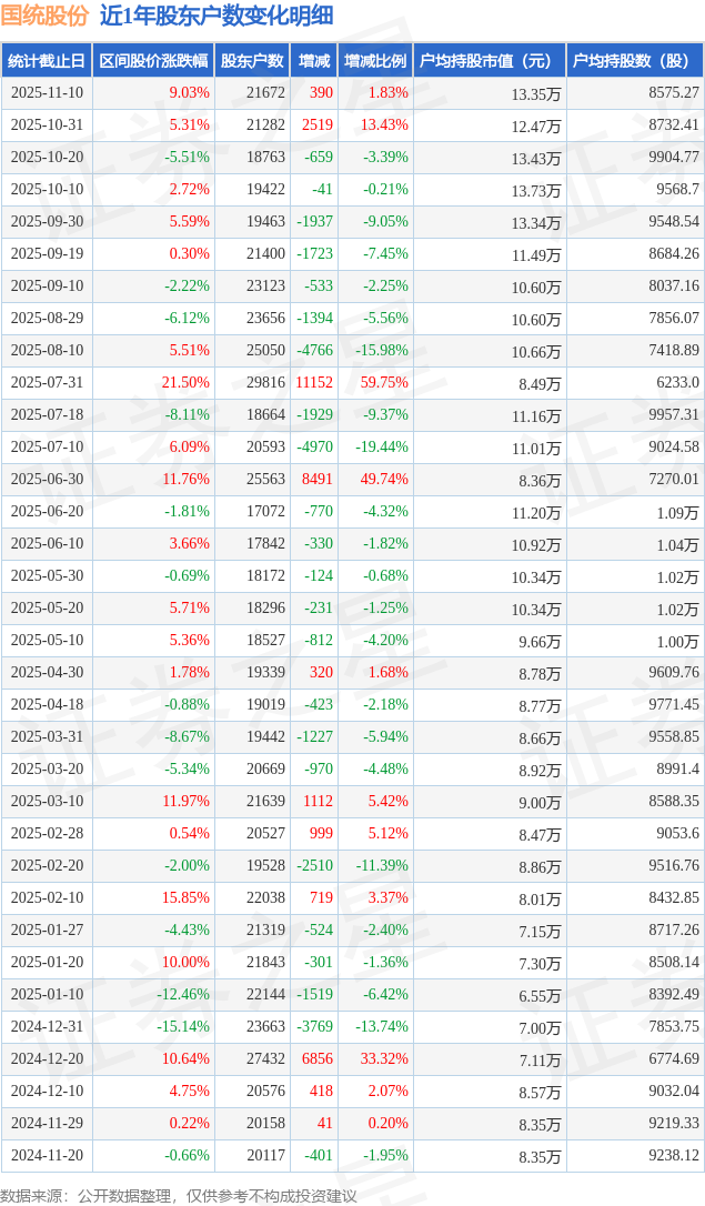 从股价来看,2025年10月31日至2025年11月10日,国统股份区间涨幅为9.03%,在此期间股东户数增加390.0户,增幅为1.83%。