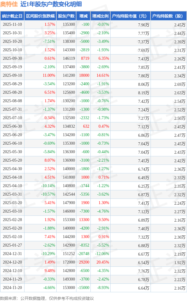 从股价来看,2025年10月31日至2025年11月10日,奥特佳区间涨幅为1.57%,在此期间股东户数减少100.0户,减幅为0.07%。