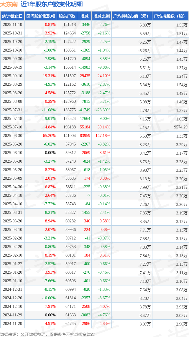 从股价来看,2025年10月31日至2025年11月10日,大东南区间涨幅为0.81%,在此期间股东户数减少3446.0户,减幅为2.76%。