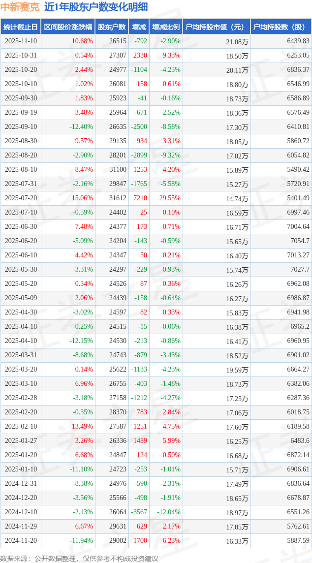 从股价来看,2025年10月31日至2025年11月10日,中新赛克区间涨幅为10.68%,在此期间股东户数减少792.0户,减幅为2.9%。