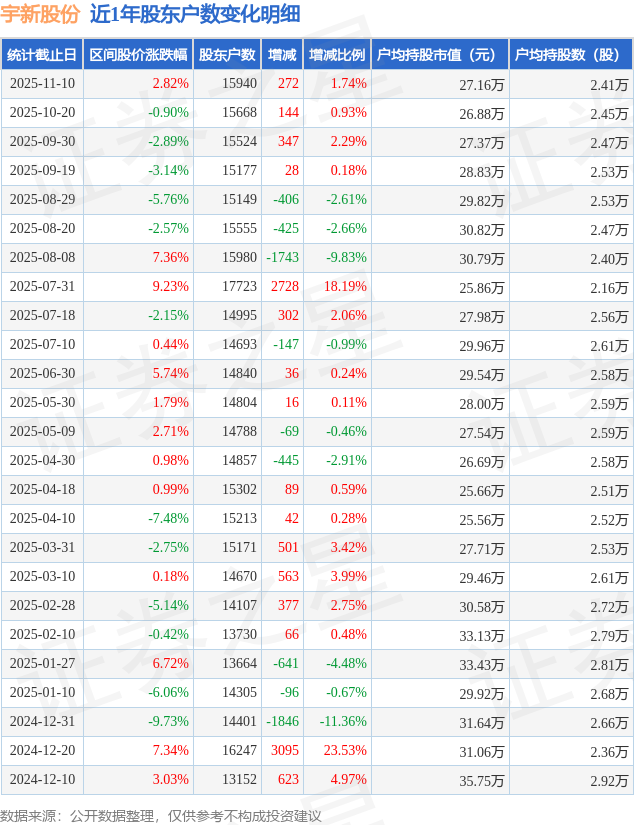 从股价来看,2025年10月20日至2025年11月10日,宇新股份区间涨幅为2.82%,在此期间股东户数增加272.0户,增幅为1.74%。