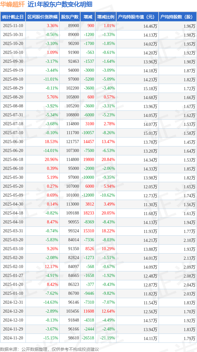 从股价来看,2025年10月31日至2025年11月10日,华峰超纤区间涨幅为3.36%,在此期间股东户数增加900.0户,增幅为1.01%。