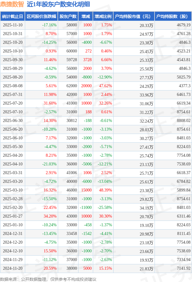 从股价来看,2025年10月31日至2025年11月10日,鼎捷数智区间跌幅为17.16%,在此期间股东户数增加1000.0户,增幅为1.75%。