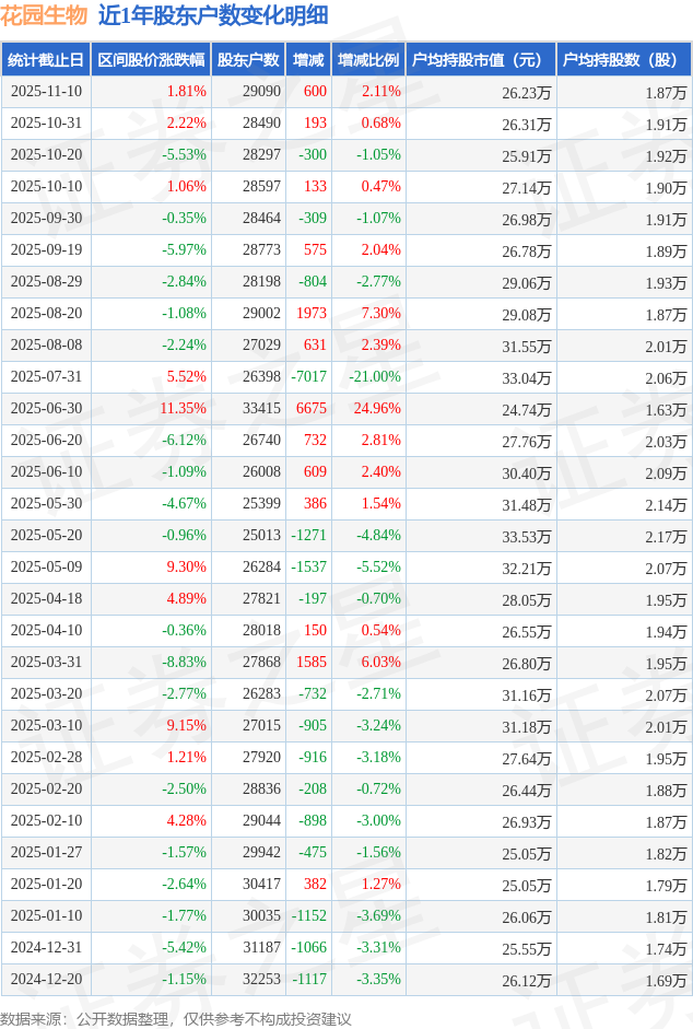 从股价来看,2025年10月31日至2025年11月10日,花园生物区间涨幅为1.81%,在此期间股东户数增加600.0户,增幅为2.11%。