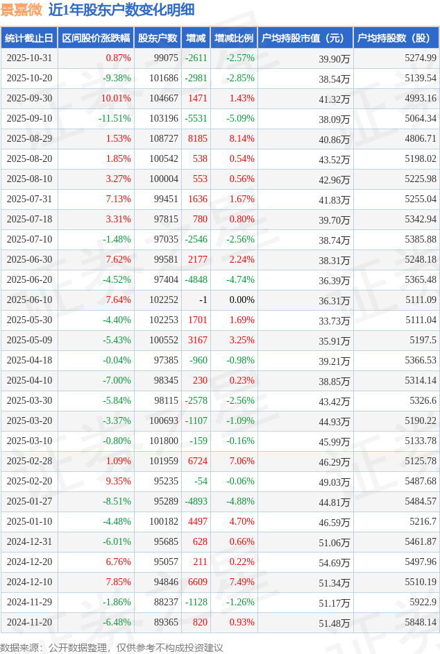 从股价来看,2025年10月20日至2025年10月31日,景嘉微区间涨幅为0.87%,在此期间股东户数减少2611.0户,减幅为2.57%。